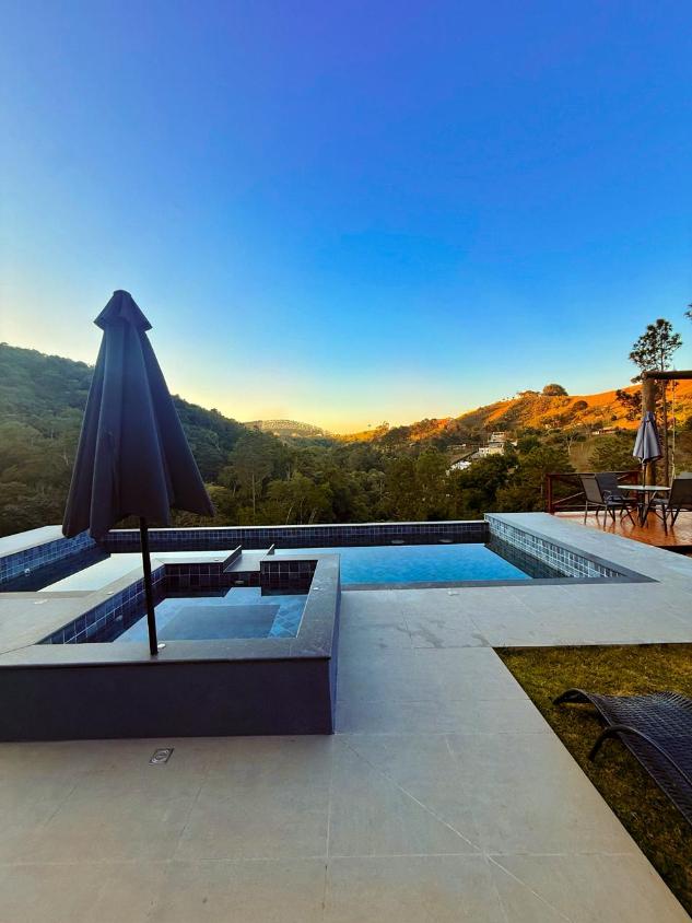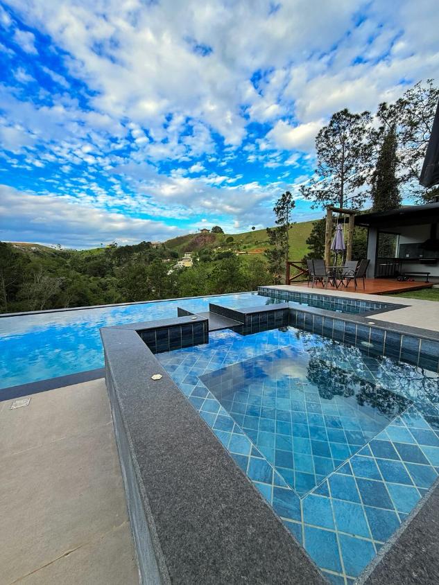 * Piscina de borda infinita com spa elevado e hidromassagem, que oferece uma vista deslumbrante da mata preservada.