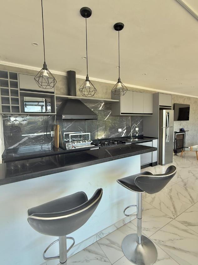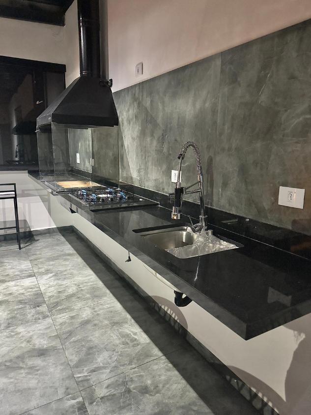 * Cozinha planejada com bancada em granito e churrasqueira integrada, unindo praticidade e sofisticação.