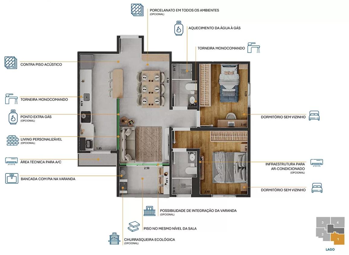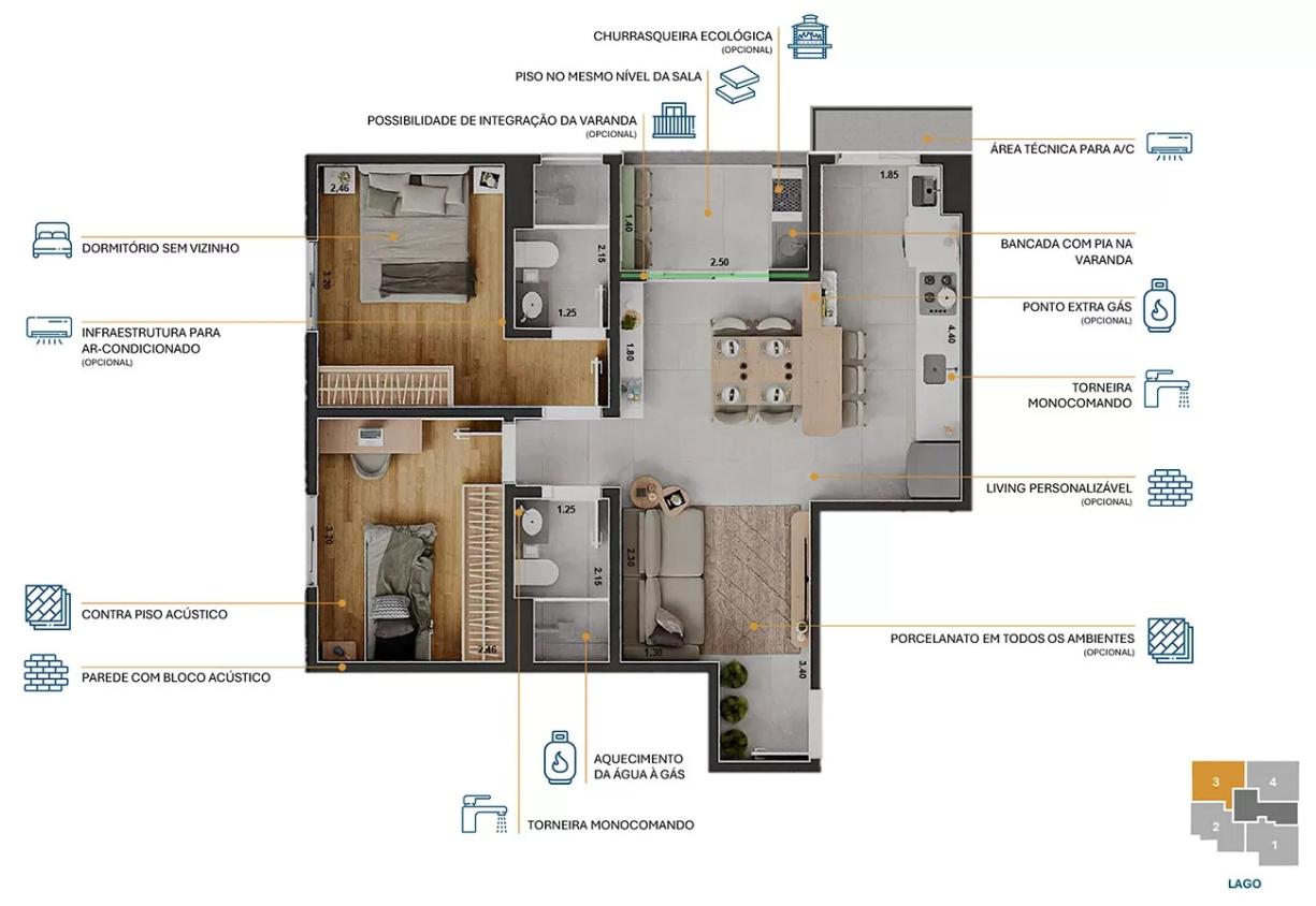 O Laguna é um empreendimento residencial com torre única, composto por 60 apartamentos de 2 dormitórios com suíte e varanda.